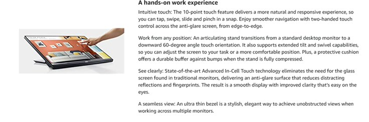 • Screen Size 24 inch, Touchscreen Type 10 point touch, Cabinet Color Black, Usage Consumer, Panel IPS,