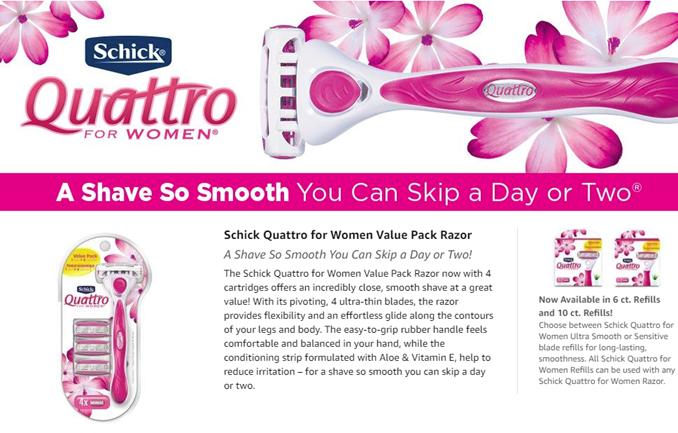 The Schick Quattro for Women Value Pack Razor now with 4 cartridges offers an incredibly close, silky smooth shave at a great value! With its pivoting, 4 ultra-thin blades, the razor provides flexibility and an effortless glide along the contours of your legs and body. The easy-to-grip rubber handle feels comfortable and balanced in your hand, while the conditioning strips formulated with Aloe & Vitamin E, help to reduce irritation - for a shave so smooth you can skip a day or two. Choose between Schick Quattro for Women Ultra Smooth or Sensitive blade refills for long-lasting, smoothness. All Schick Quattro for Women Refills can be used with any Schick Quattro for Women Razor.