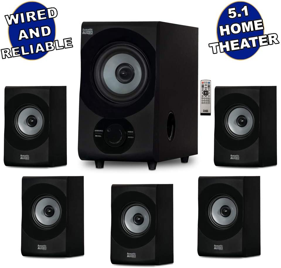 Acoustic Audio AA5172 700W Bluetooth Home Theater 5.1 Speaker System with FM Tuner, USB, SD Card, Remote Control, Powered Sub (6 Speakers, 5.1 Channels, Black with Gray)