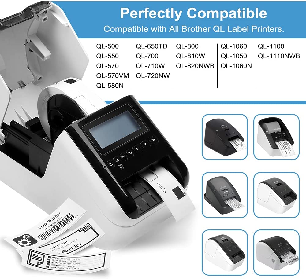 • Compatible with Brother QL-800 QL-710W QL700 QL-810W QL-500 QL-820NWB QL-1100 QL-1100NWB QL-1110NWB label printers...(please see the detail description below for more printer models) Work with Phomemo D520 shipping printer.
