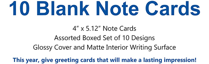 • USE: Boxed Notecards Stationery set for writing thank you notes and general wishes, be it to your friends, family, children, co-workers, neighbors, or sending notecards for kids at camp. Card's cover pages are printed on snow white coated stock and have a gloss finish, while the cards interior pages are uncoated for a smooth and flawless writing surface. Assorted Cards for All Occasions Box Set, for men and women, husbands and wives alike.