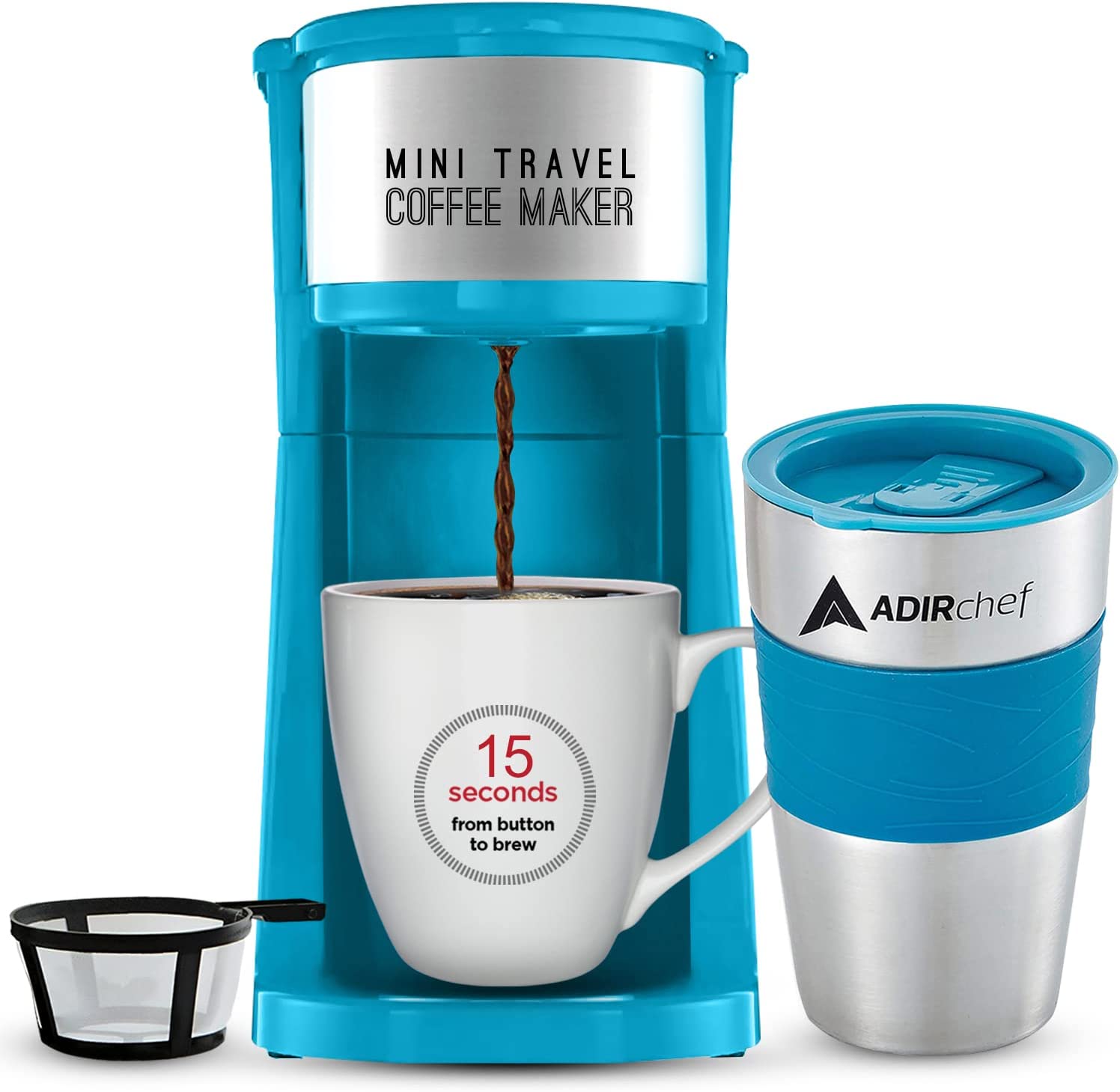 AdirChef Mini Coffee Maker - Single Serve Coffee Maker, 15 oz. Travel Coffee Mug Coffee Tumbler & Reusable Coffee Filters - Ideal for Home, Office, Outdoor & More - Blue