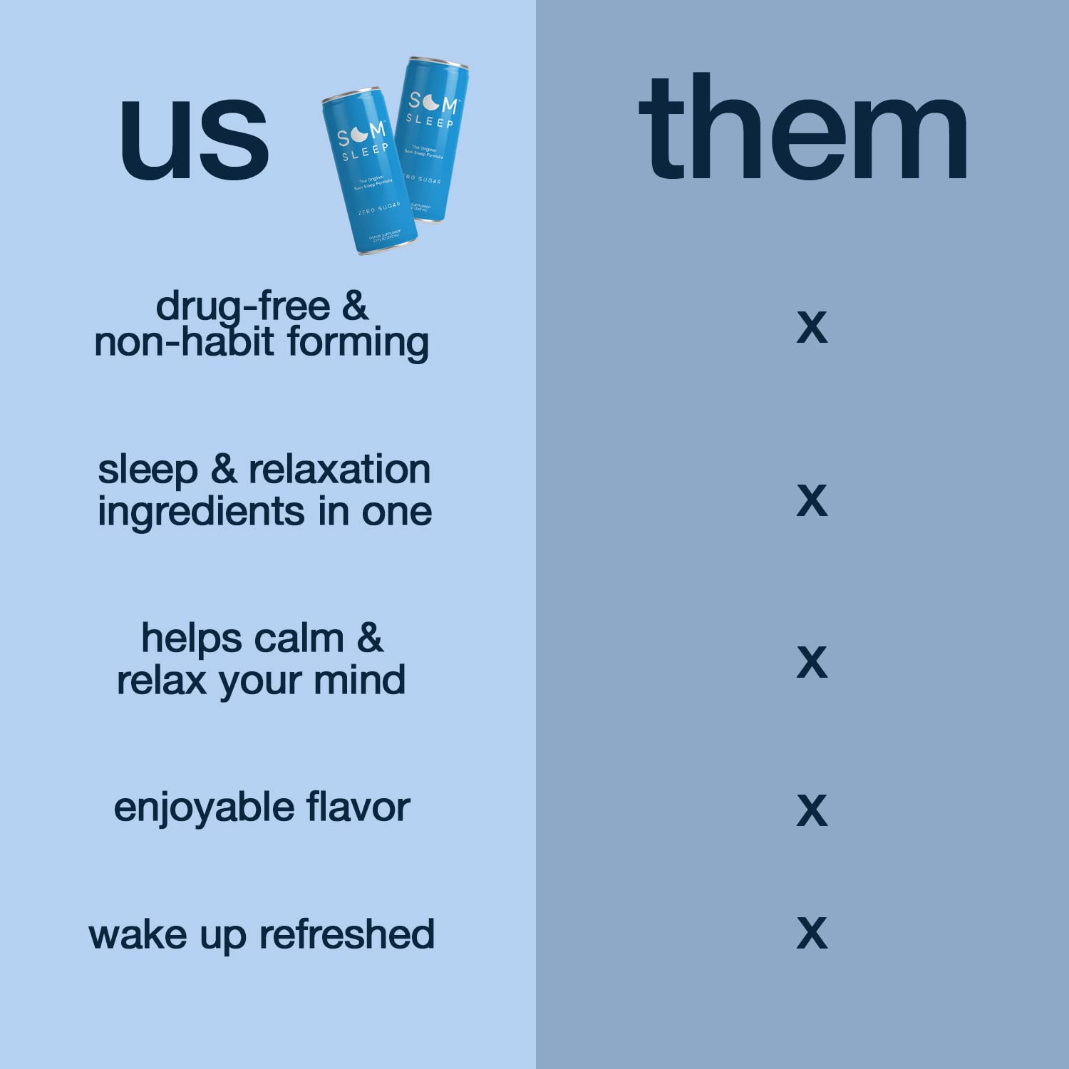 • We get it. We like our morning cup of coffee or energy drink, too. But too much caffeine can make it difficult to fall asleep at night. That’s why we created Som, a clean alternative to existing sleep aids that won't leave you groggy the next morning.