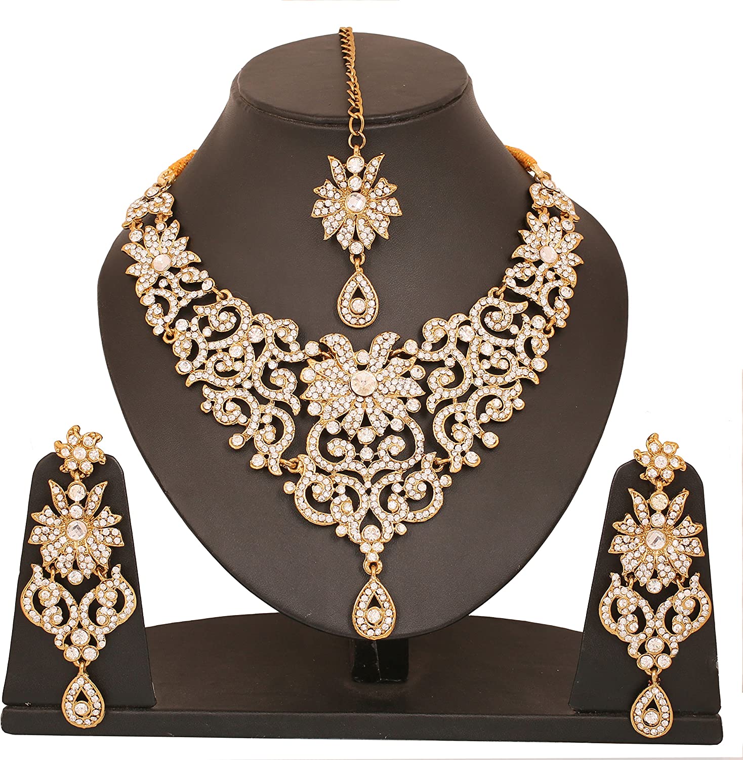 Touchstone Indian Bollywood Gorgeous intricate Workmanship Sparkling White Colorful Rhinestone crystal wedding Designer Jewelry Necklace Set In Gold or Silver Tone For Women.