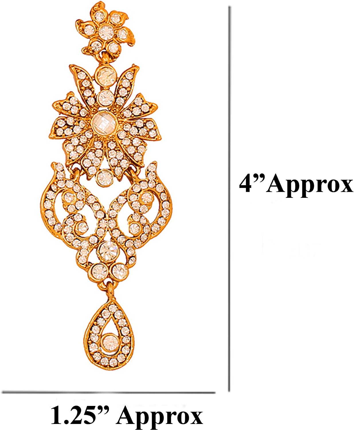 Touchstone Indian Bollywood traditional royal look attractive filigree carving white Rhinestone grand bridal designer jewelry necklace set for women in antique gold tone EXTRA LONG EARRINGS. Length 4 inches SPECIFICATIONS : Necklace circumference 8 inches with adjustable/extendable soft tassel. Earring weight (single) 18 gms. Earring length 4 inches. Earring width 1.25 inches. This is in a special dark gold plating to recreate the look of antique jewelry.