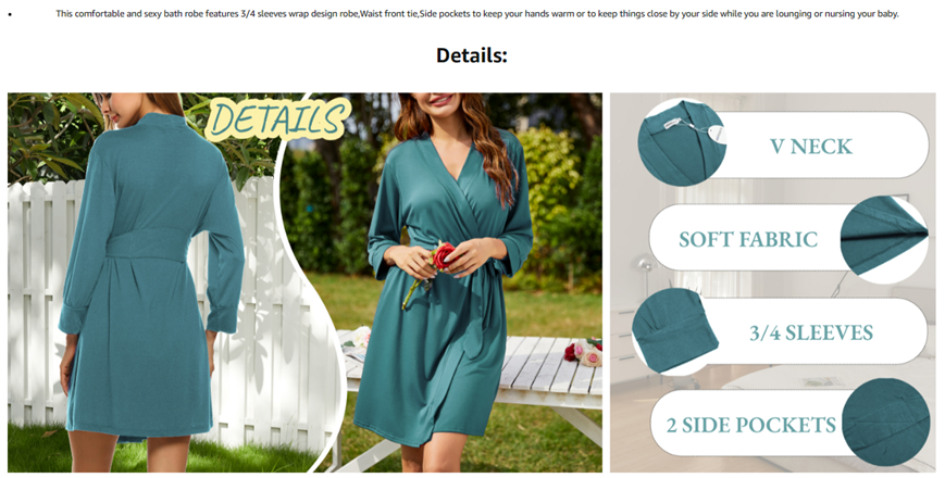 • 【Unique Design】:This comfortable and sexy bath robe features 3/4 sleeves wrap design robe,Waist front tie,Side pockets to keep your hands warm or to keep things close by your side while you are lounging or nursing your baby.