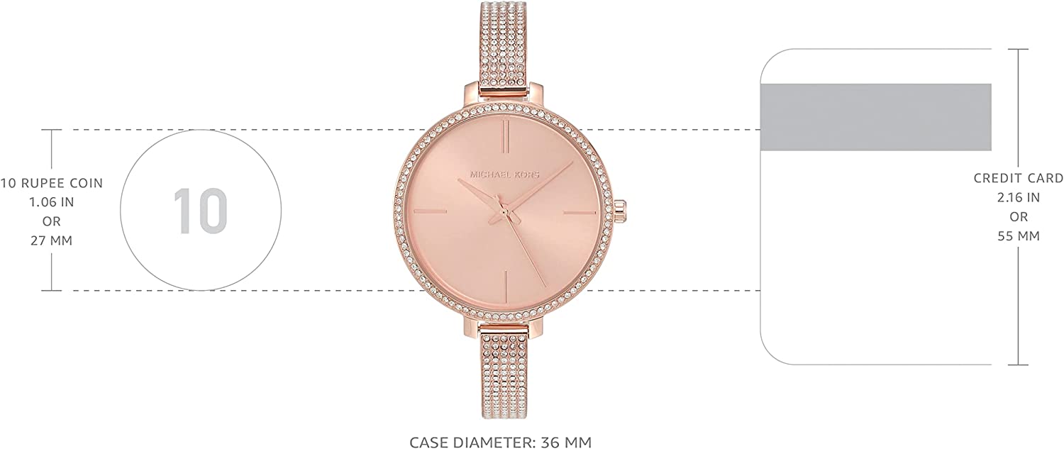Featuring a 36mm case, 8mm band width, scratch-resistant mineral crystal glass, Quartz movement with 3-hand analog display, imported