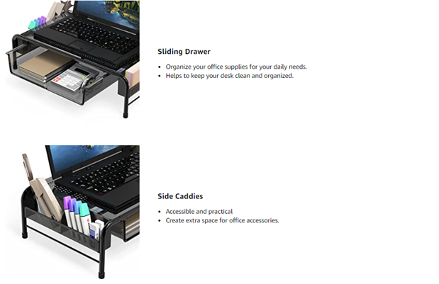 • Raises your monitor to a confortable viewing height. Reduce neck and eye Strain