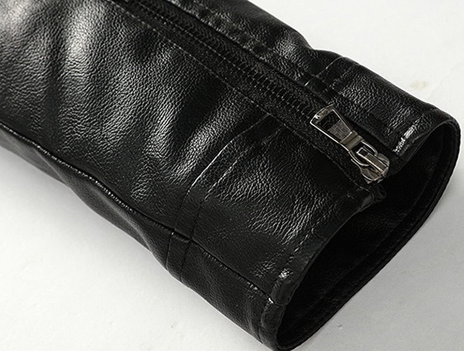Ribbed stand collar,full zipper,pockets,adjustable zipper cuffs,stitching details,motorcycle jacket style
