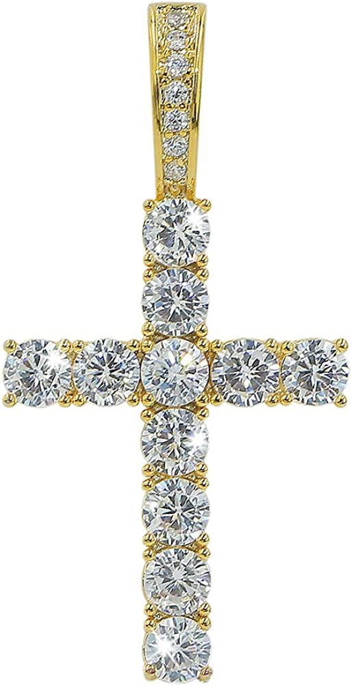 • The classic cross pendant is 18k gold plated over the premium brass,hypoallergenic and lead/nickel free. The tennis chain made of brass which is unlike the alloy cheaper chains, heavy feeling and quality makes it looks and feels expensive.This pendant necklace will be sure to catch people's eye. Each stone is carefully set by hand by a professional jeweler, creating a totally iced out look! Every thing you want in a cross pendant maybe like this.