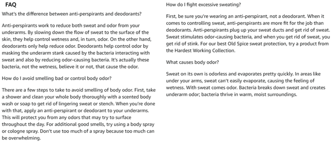 | Description | Long-lasting scent with sweat and odor protection. | One spray keeps you fresh all day. | Drop-kicks dirt and odor. | Provides 24-hour odor and sweat protection. | 24-hour odor protection. |