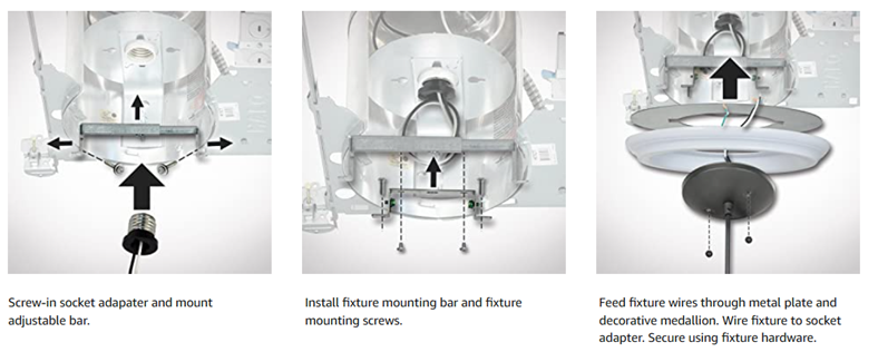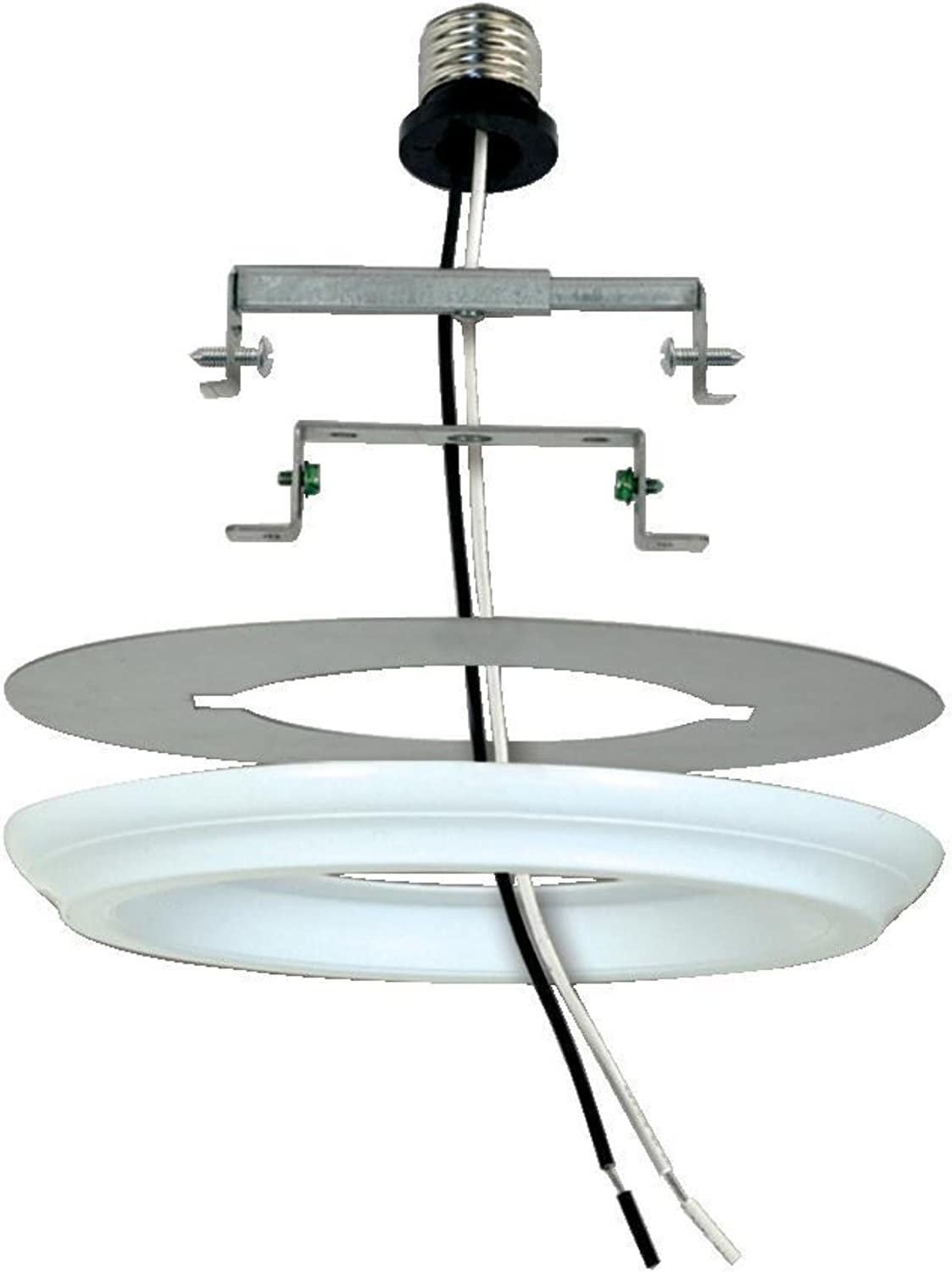 This unique patent-pending Westinghouse Recessed Light Converter offers an easy way to transform your existing recessed lighting into a pendant or light fixture with no major remodeling. Let your creativity inspire you to update your home lighting with this quick and easy upgrade. Hang any pendant or other light fixture of 50 pounds or less where recessed lighting is currently used in your home.The Recessed Light Converter adjusts to any can size between 4-inch and 6-inch, there are no visible screws or hardware and the decorative medallion can be painted to match any decor. This converter works with existing recessed cans that use medium base PAR16, R16, A19, R20, PAR20, BR25, BR30, R30, PAR30, BR38, PAR38, BR40 or R40 light bulbs and is suitable for damp locations.Perfect for kitchens, family rooms or anywhere recessed lighting is used. It includes a versatile white decorative medallion, adjustable bar, socket adapter and mounting hardware for convenient installation.This Westinghouse Recessed Light Converter is CETL listed for safety.Product reference number 01011.