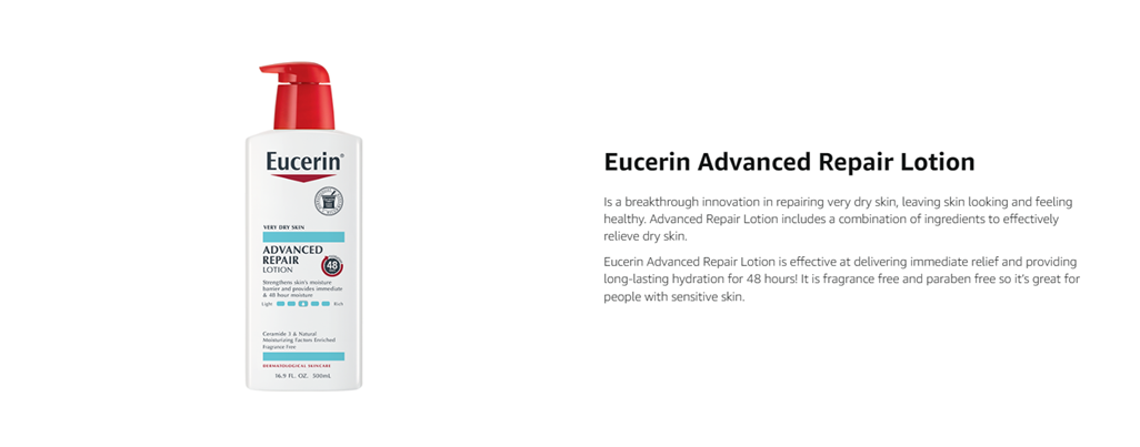 • Free Of: Eucerin Advanced Repair lotion is a paraben free body lotion, and is fragrance free, dye free, and is also lightweight, fast-absorbing and non-greasy