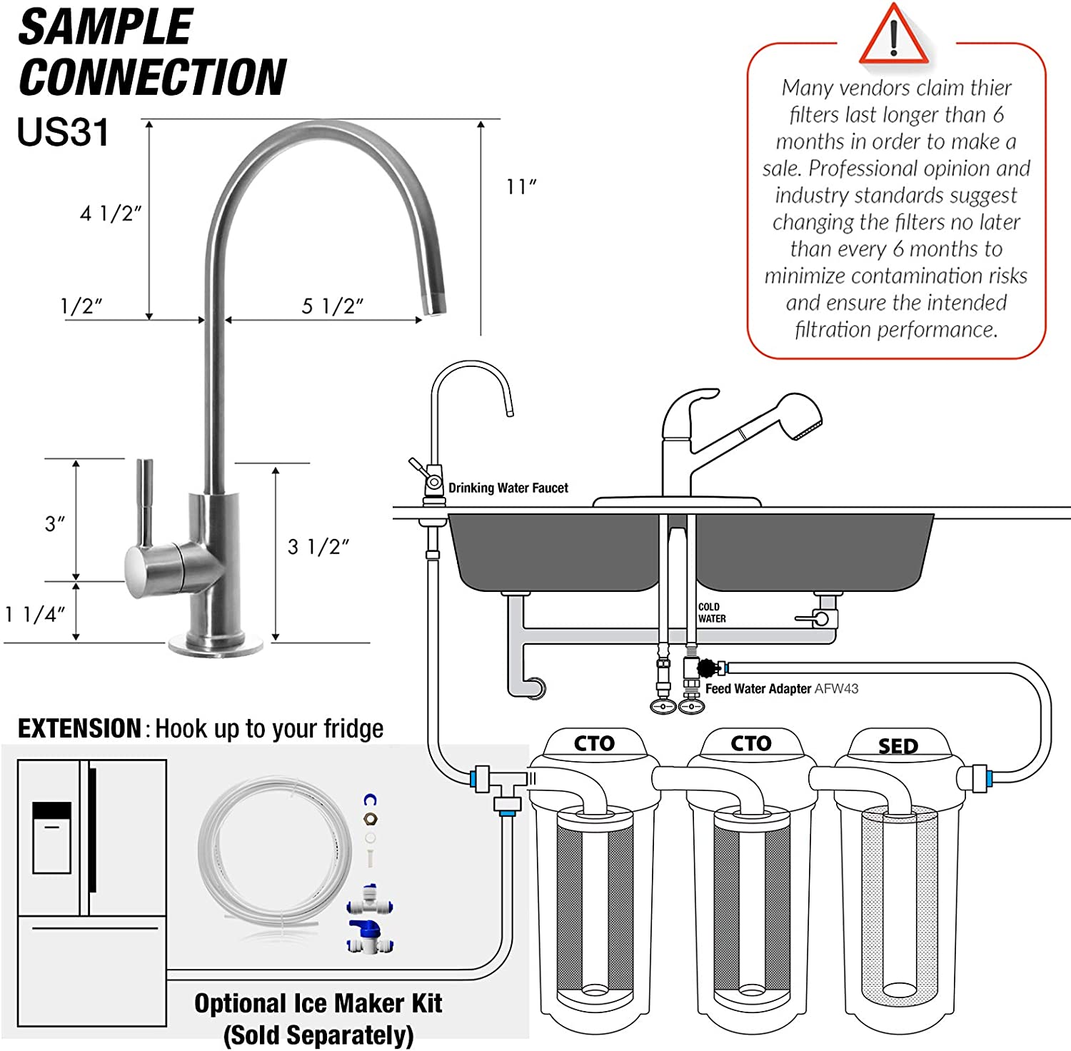 • [Easy to Install and Maintain]: This system is designed for easy installation, low maintenance, and features dual carbon block filters along with a high-capacity sediment filter. The sediment filter protects and extends the life of your system, while the carbon block filters work to remove many harmful contaminants a. You can replace the filter every 6 to 12 months, judged by the water’s taste.