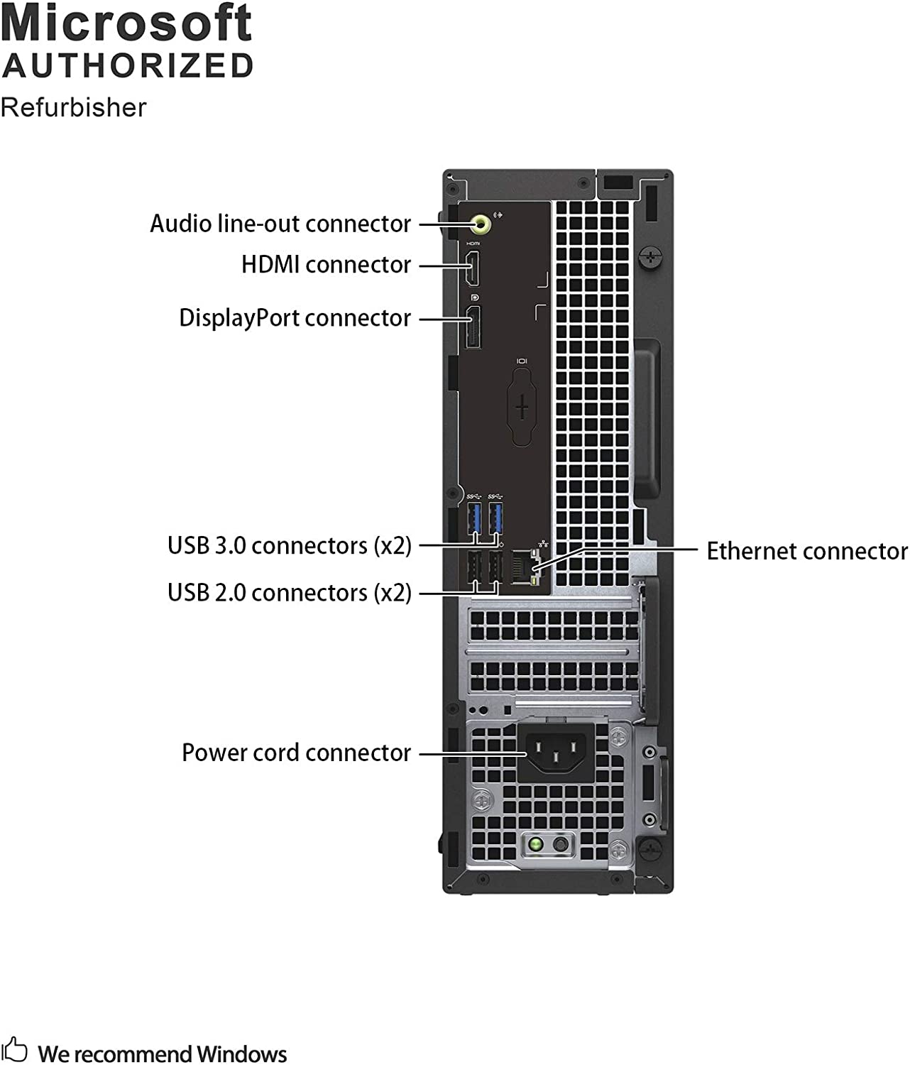 ProcessorIntel Core 7th Generation i5-7500 Processor (Quad Core, up to 3.80 GHz, 6M Cache, 65W)Operating SystemWindows 10 ProMemory8GB DDR4Hard Drive256GB 2.5Inch SATA Class 20 Solid State DriveGraphics CardIntel Integrated GraphicsOptical DriveNoneWirelessNo Wireless CardKeyboard and MouseIncludedPorts & Slots1 x Power button1 x Universal Audio Jack4 x USB 2.0 ports4 x USB 3.1 Gen 1 ports1 x HDMI 1.41 x DisplayPort 1.21 x 1/8" (3.5 mm) Headphone/Microphone1 x 1/8" (3.5 mm) Line-Out1 x Integrated Speaker1 x RJ-45Dimensions & Weight3.7 x 11.4 x 11.5" / 9.4 x 29.0 x 29.2 cm11.31 lb / 5.13 kg (Minimum weight)