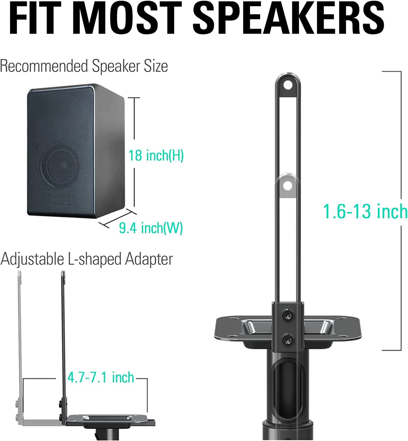 • Safe & Stable - 9.8" x 9.8" wide base and 4.7" x 4.7" top plate keep your speaker balanced and safe. With the adjustable speaker bracket, the floor stand can work on speakers with mounting hole up to 13 inches height