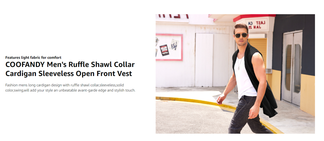 - Fashion mens long cardigan design with ruffle shawl collar,sleeveless,solid color,swing,will add your style an unbeatable avant-garde edge and stylish touch.