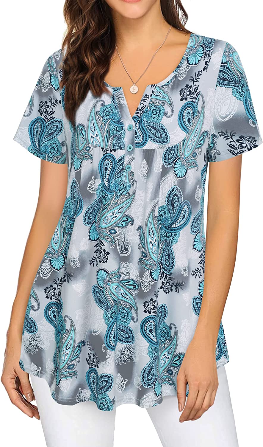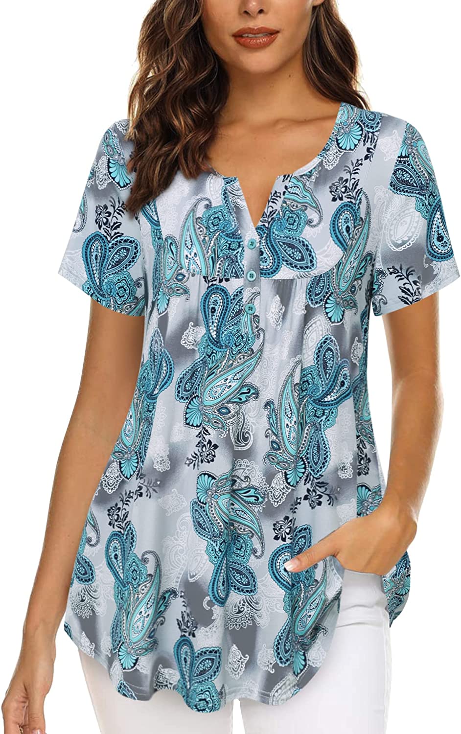 • Features: Henley v neck,Button-up,Paisley pattern or solid color, cute front ruffle and flowy hem can perfectly modify the belly, good length can cover hips and easy to pair with leggings, pants and shorts etc, very casual, soft, lightweight and comfortable