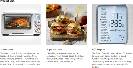 • LCD DISPLAY: LCD display to easily access the built in smart functionality and all cooking functions; The LCD also indicates when pre-heat has completed and automatically begins to count down on the cooking time for perfect results
