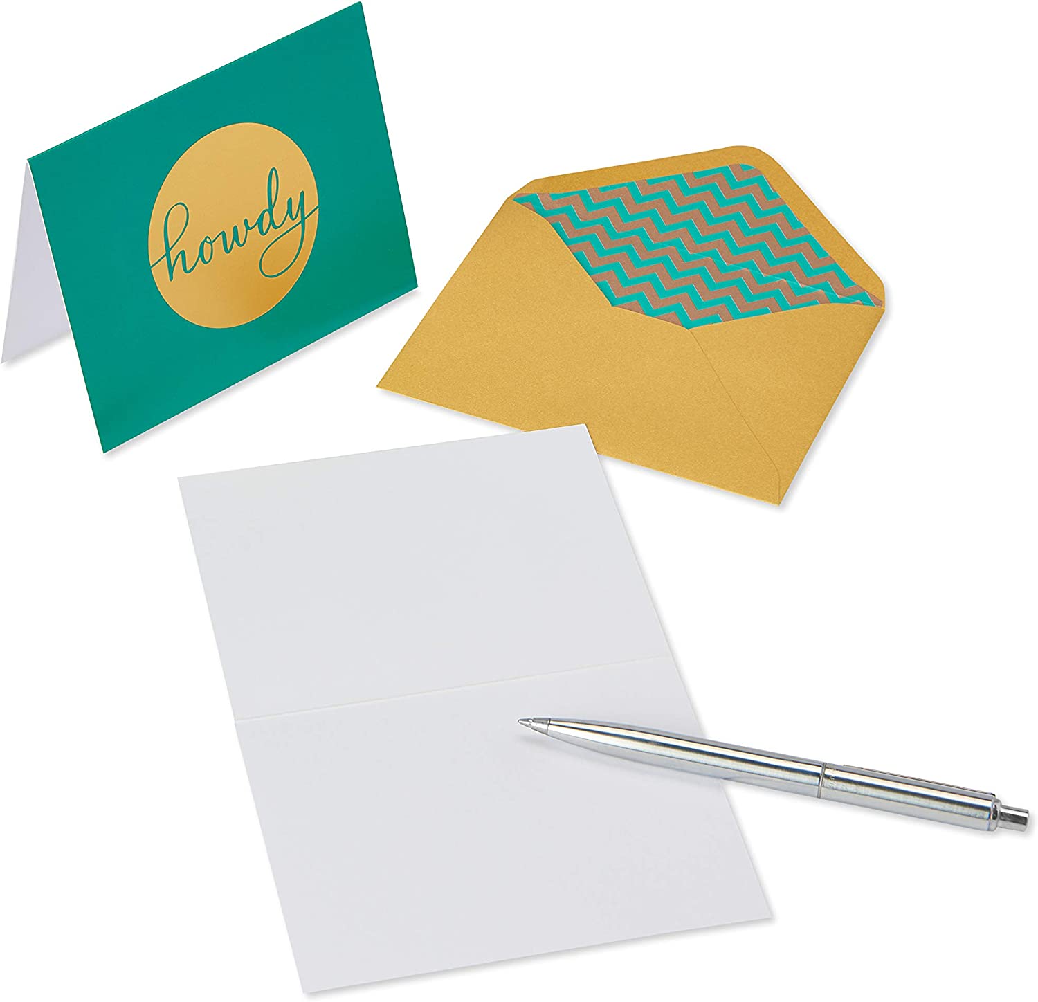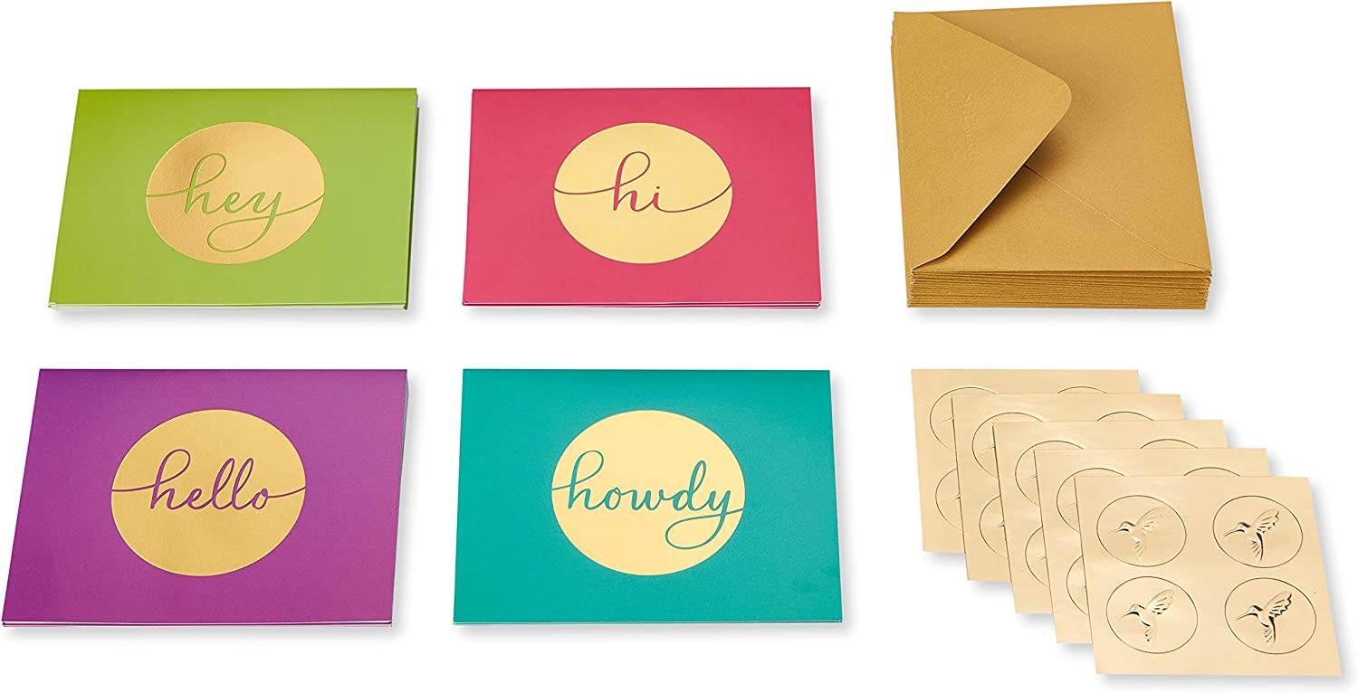 Stay in touch with cheerful stationery sets from Papyrus! These bright and colorful blank cards feature a variety of greetings (Hi, Hey, Howdy and hello) with shimmering, gold foil embellishments. Great for anytime hellos or sending a simple thank you, kids’ Thank you, teacher Thank you, birthday party thank you, client Thank you and more, Each card is blank inside so you can write a personal message. Packaged in a two-piece Keepsake box decorated with bright patterns and gold foil, The set includes: 20 blank Greeting cards (5 each of 4 designs), 20 lined, pearlescent Envelopes and 20 Embossed, gold Foil seals. Crafted with Papyrus quality materials and signature style, These versatile boxed cards will brighten anyone's day!