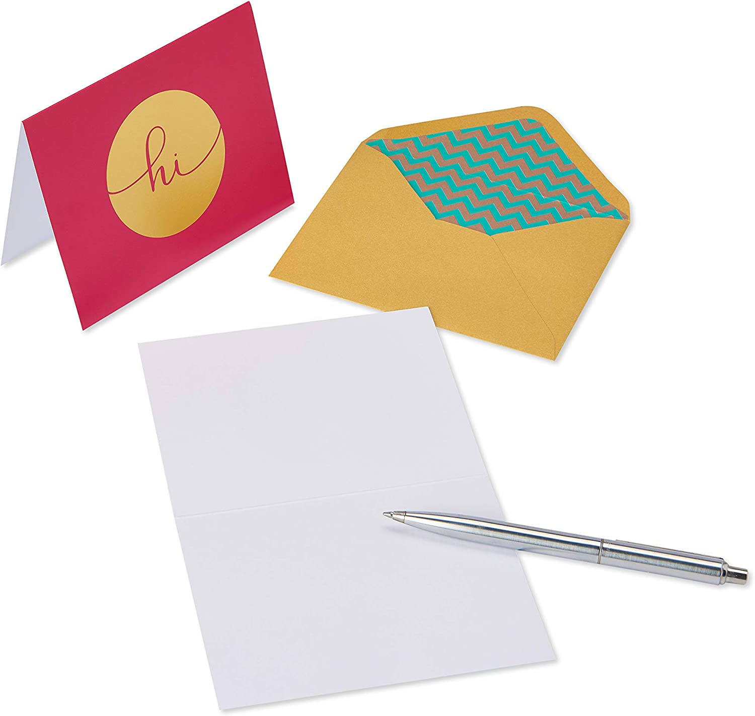 • Papyrus boxed stationery features four colorful Hello notes with Gold foil embellishments, packaged with shimmering envelopes in a keepsake box.