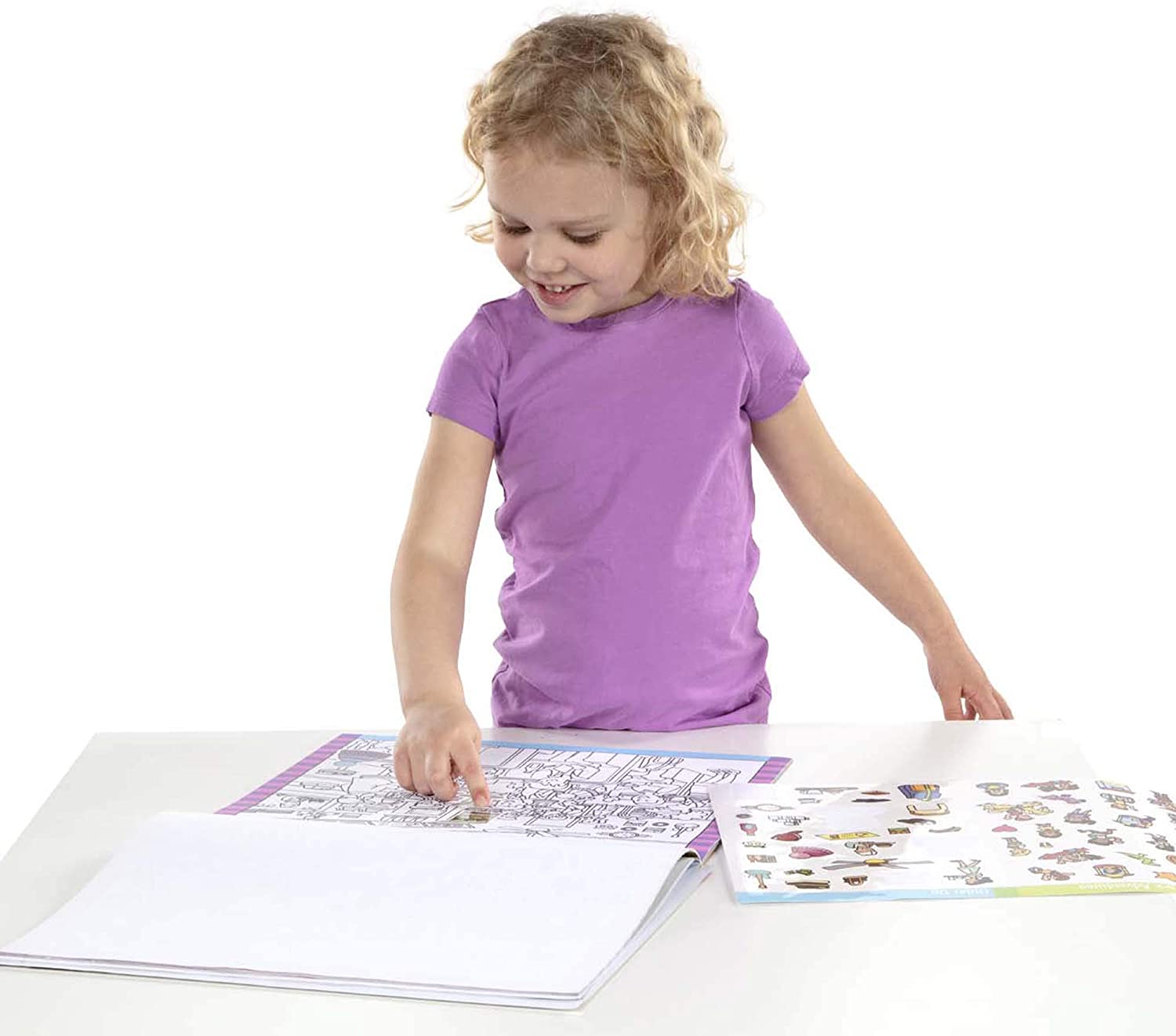 This fun pad is a seek-and-find game, a coloring pad, and a sticker pad all rolled into one! Match more than 400 full-color stickers to hidden objects on 14 town-themed pages, then color in the detailed scenes with pencils, markers, or crayons to create one-of-a-kind pictures. Sticker pages are color-coded and labeled to match scenes. The detail-rich scenes include a farmers market, hospital, highways, park, school, airport, amusement park, restaurant, mall, museum, café, construction site, bus station, and firehouse. Perforated edges make it easy to remove sticker pages to match to scenes.