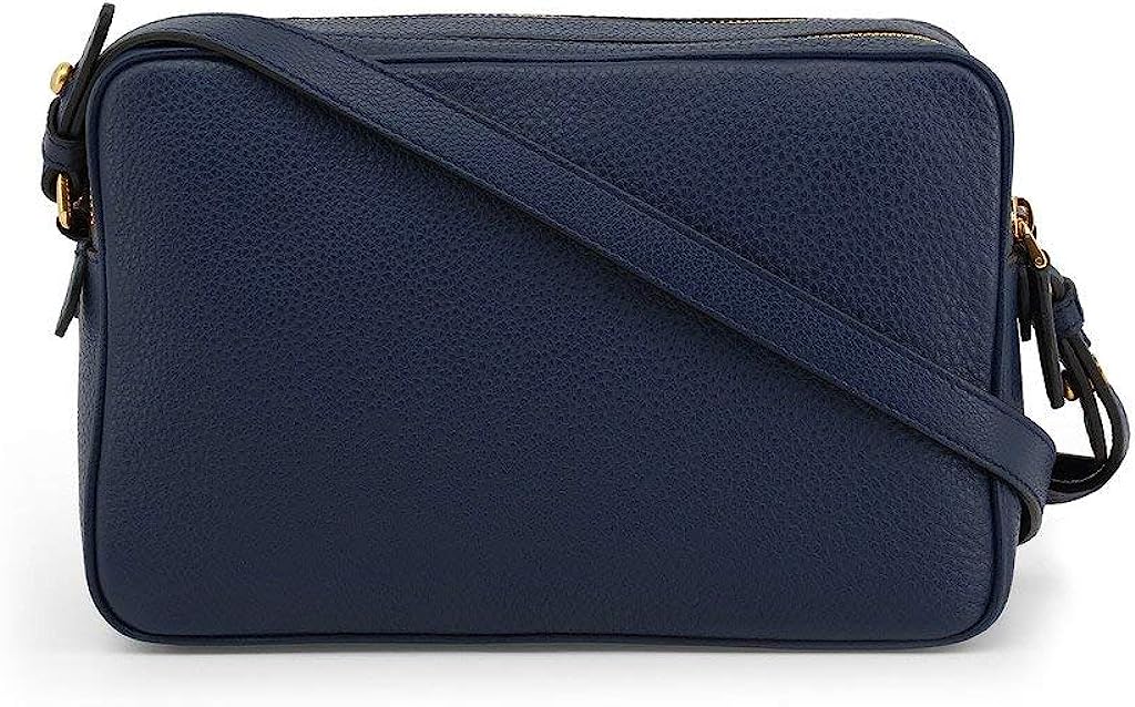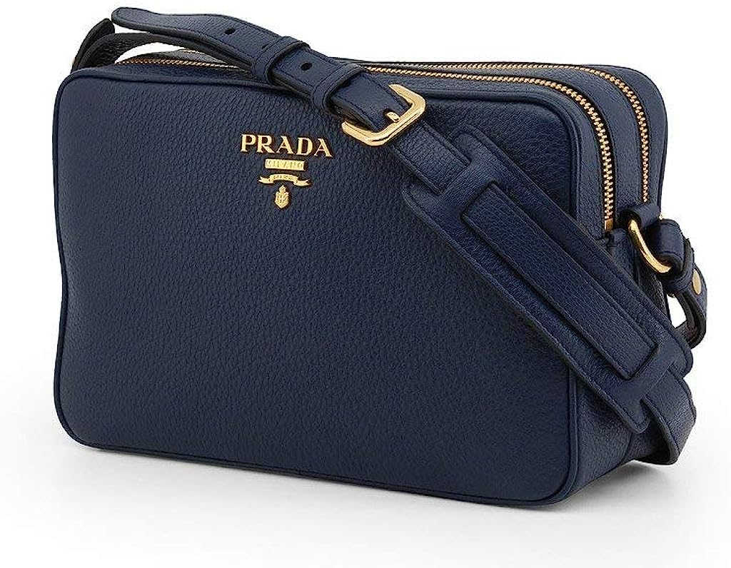 This crossbody bag is crafted with navy blue vitello phenix pebbled leather. The bag features a gold Prada Milano logo on the front and an adjustable leather strap. The two zipper compartments open to a spacious jacquard lined interior that allows for convenient storage and organization.