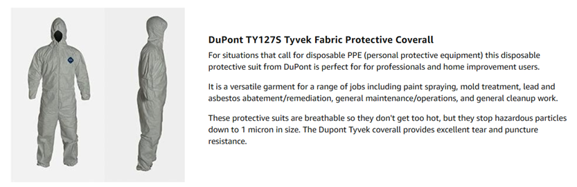 Tyvek 400 garments are composed of flash spun high density polyethylene which creates a unique, nonwoven material available only from DuPont. Tyvek 400 provides an ideal balance of protection, durability and comfort of any limited use fabric technology. Tyvek 400 fabric offers an inherent barrier against particles (down to 1.0 micron in size). Protection is built into the fabric itself; there are no films or laminates to abrade or wear away. Tyvek 400 fabric's durability advantage over microporous film fabrics delivers consistently better barrier, even after wear and abrasion. Applications include: lead and asbestos abatement/remediation, general maintenance/operations, spray painting, general clean-up.
