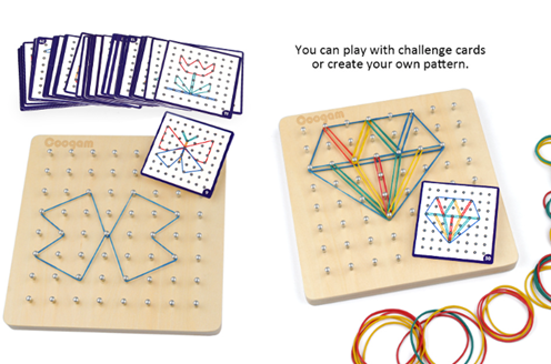 The pattern cards contains some geoboard sheets of animals and shapes to give kids an idea of what he can do with them. That will help them see the possibilities of such a simple toy and later they can make their own shapes and designs.