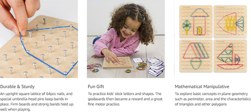 Great for developing fine motor skills, concentration and creativity. As kid grows older this can be used to make complex patterns so the use is long term. To explore geometric concepts such as perimeter, area and the characteristics of triangles and other polygons.