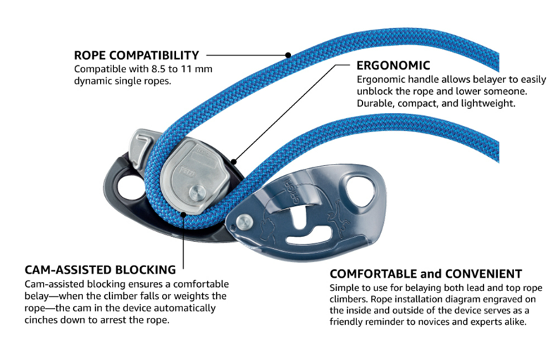 • CAM-ASSISTED BLOCKING: Cam-assisted blocking ensures a comfortable belay—when the climber falls or weights the rope—the cam in the device automatically cinches down to arrest the rope.