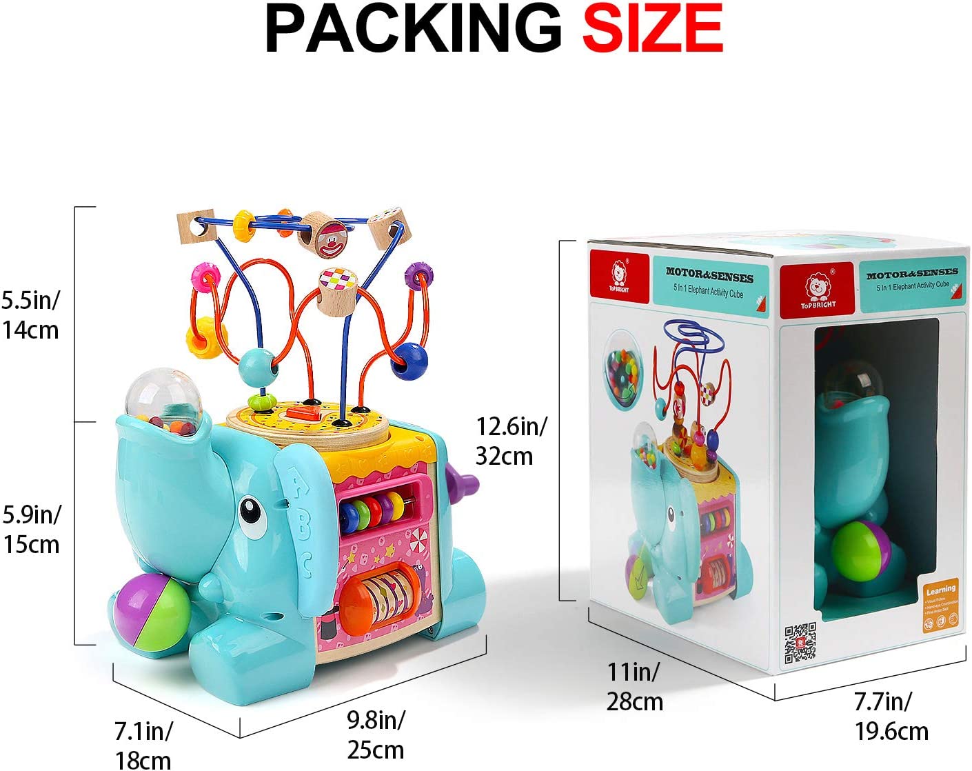 • 5 SIDES OF ACTIVITIES: Exploration and fun is around each corner of this activity cube toy for 1 2 year old boy and girl. This activity cube has five different sides of game-plays which make children more interested in, including rainbow spinning gear, turning wheel, color counting beads and even a rotatable and detachable bead maze. Pull the ball on the trunk of the elephant, and then the colored beads in the transparent ball will beat.