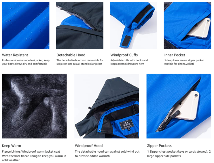 • Windproof: Adjustable cuffs with hooks and loops; Internal drawcord hem, detachable and adjustable storm hood help to keep wind out. Note: Zipper on the Left side