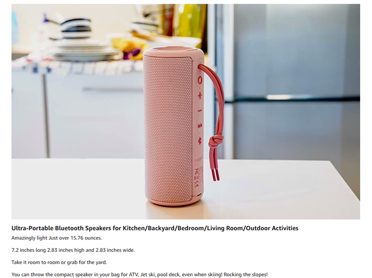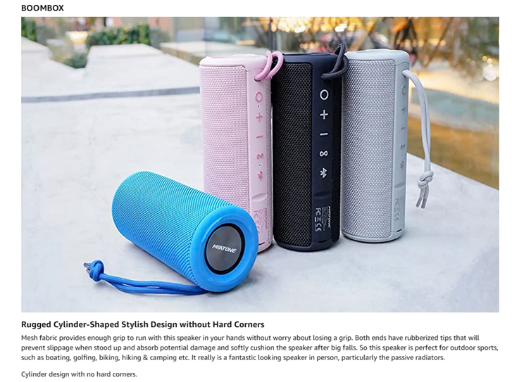 • [Rugged Cylinder - Shaped Housing] Mesh fabric provides enough grip to run with this portable speaker in your hands without worry about losing a grip. Both ends have rubberized tips that will prevent slippage when stood up and absorb potential damage and softly cushion the speaker after big falls. So this speaker is perfect for outdoor sports, such as skiing, golfing, biking, hiking & camping etc.