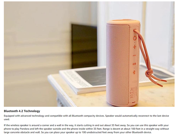 • [Bluetooth V4.2 Range Testing] If the wireless speaker is around a thick concrete corner/ wall in the way, it starts cutting in and out about 33 feet away. So you can use this speaker with your phone to play Pandora and left the speaker outside and the phone inside within 33 feet. Range is decent at about 100 feet in a straight way without concrete obstacle and wall. So you can place your speaker up to 100 unobstructed feet away from your other Bluetooth devices.