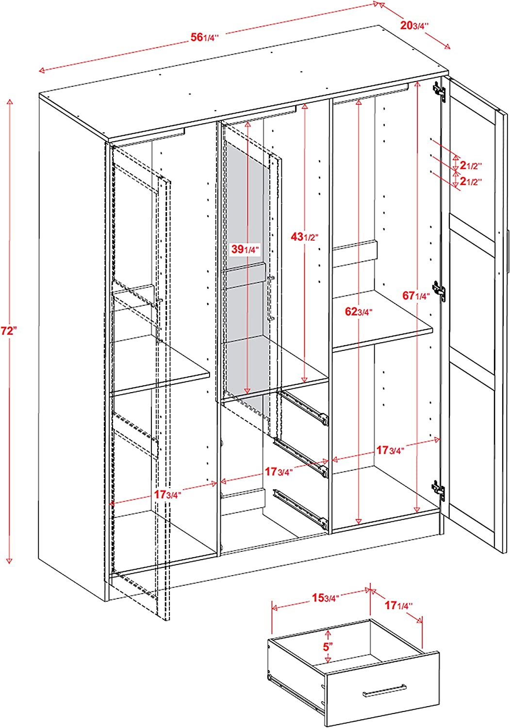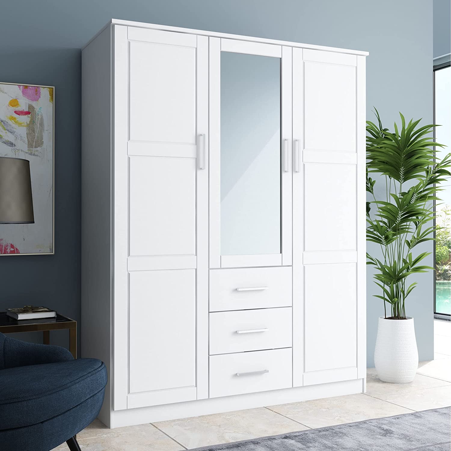 Palace Imports Cosmo Solid Wood 3-Door Wardrobe with Mirror and 3 Drawers, White. Additional Shelves Sold Separately.