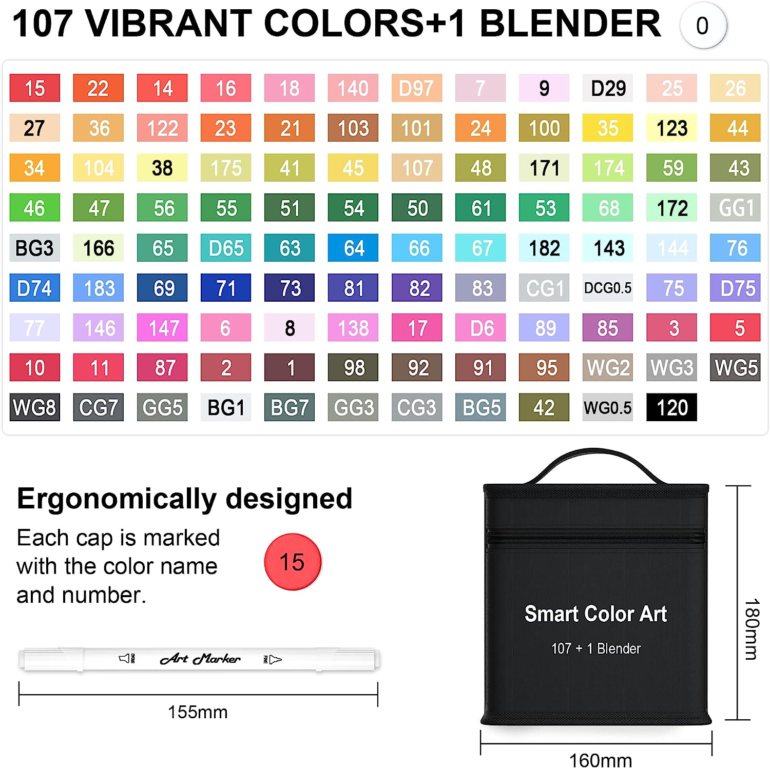 108 Pack Art Markers, 107 Coloring Markers and 1 Blender, Alcohol Based Dual Tip Permanent Markers Highlighters with Case, Excellent for Adults Kids Marking Drawing Sketching by Smart Color Art