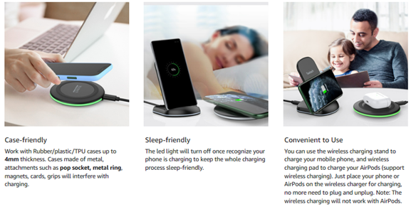 | Whats in the box | User Manual, Wireless Charging Stand, Wireless Charging Pad, 3. 3ft USB Type C Cable |