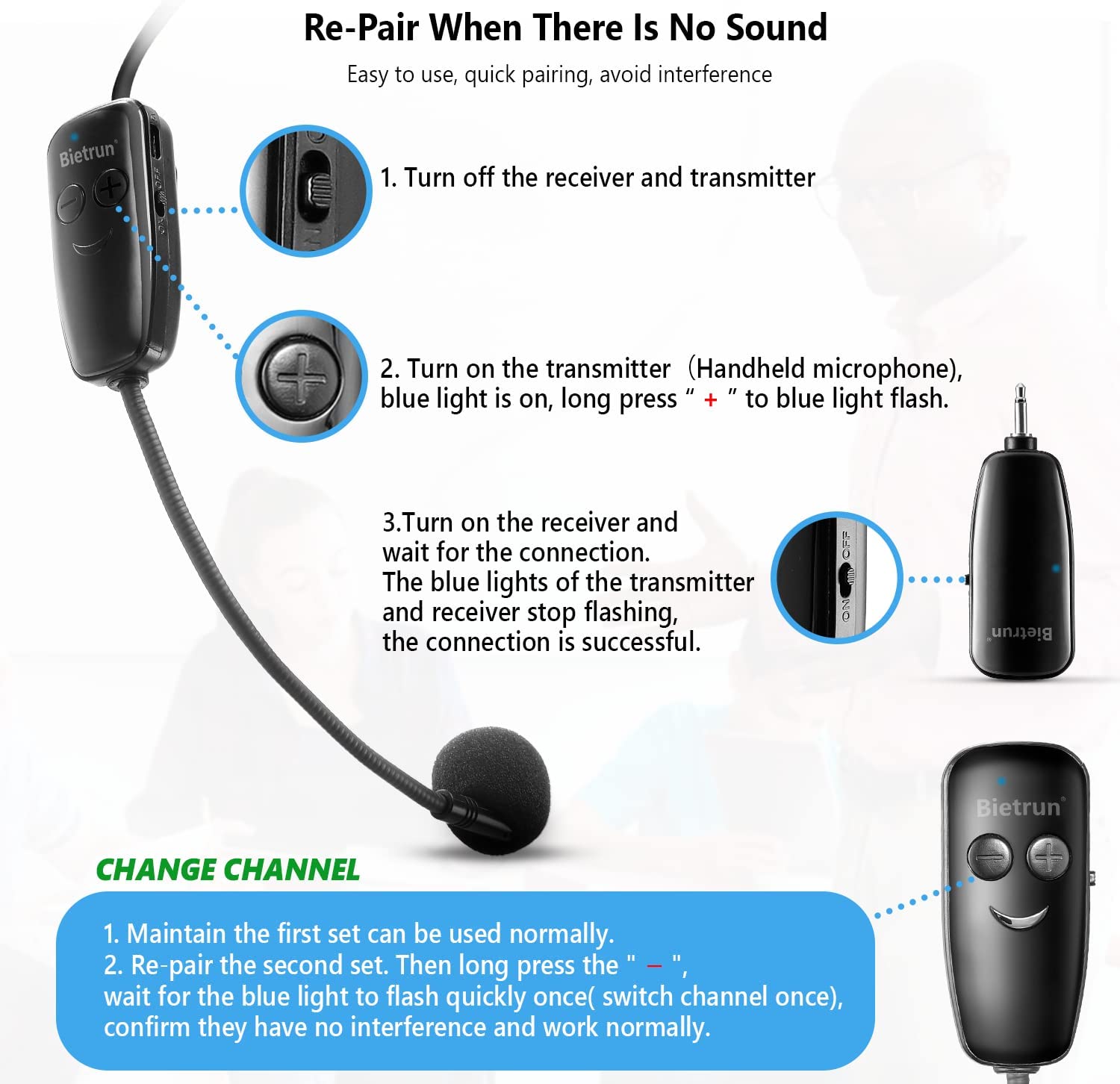 • Easy to use: Please turn on the transmitter and receiver power switches, the blue light will flash for approximately 2s. Indicator light stops flashing after a successful match, then you can use it. No further operation. ●Headset and handheld is 2 in 1 design, easily change the handheld mode to headset mode to meet your needs. Not supported Android Phones, Iphones, Macbooks, Laptop, Bluetooth Speaker.
