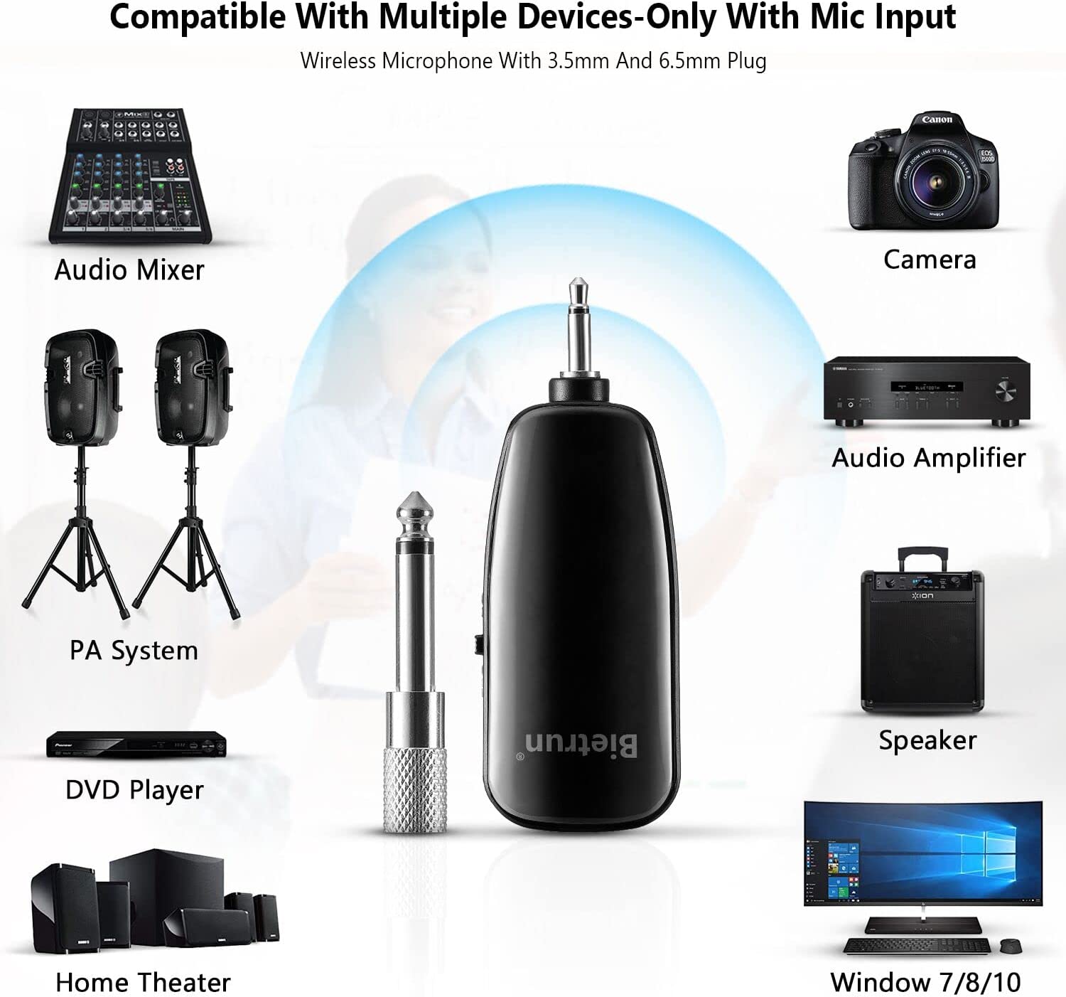 • Wireless microphone headset system: Only for Mic Jack, not Aux Jack, otherwise no sound ●Built-in high sensitivity condenser microphone, transmission distance upgrade to 160 Feet (50m) ●Signal Stability●No Delay●No Radiation ●Anti-Howling ●Anti-Jamming ●Constant Frequency ●Clearer Sound Quality. Compatible voice amplifiers, multimedia. It is a portable Karaoke equipment.(Excludes Amp&Not supported Iphone, bluetooth speaker, PC and Laptop) ●Obtained by FCC test.
