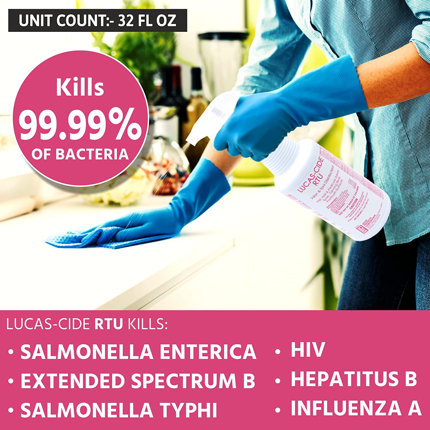 • EASY TO USE: Mix 1/2 ounce of LUCAS-CIDE with one gallon of water. Use it at the end of the day on major surfaces such as counters, floors, restrooms, staff kitchens, break rooms as well as on the equipment.