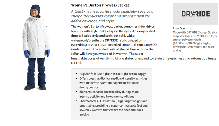 The women's Burton Prowess Jacket marries fashion-forward fabrics and design with rider-driven features to create a jacket that's easy on the eyes – on and off the mountain. An exaggerated drop tail adds style and seals out cold, while waterproof and breathable DRYRIDE 2L fabric outperforms everything in your closet. Forty percent recycled content THERMOLITE insulation with the added cush of Sherpa fleece inside the collar will have you wrapped in warmth. Our exclusive thermo-regulating Living Lining offers the ultimate in adaptable warmth and consistent comfort.