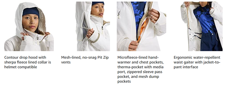 • Mesh-lined sleeve vents add breathability; Media and goggle pocket and mesh dump pocket for storage; Low-bulk Sherpa fleece-lined collar provides warmth