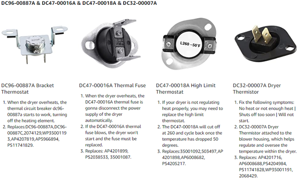- Professional Customer Service: You will get 1 x DC47-00019A heater element, 1 x DC47-00018A thermostat , 1 x DC47-00016A thermal fuse, 1 x DC32-00007A thermistor and 1 x DC96-00887C thermal fuse. We offer an unconditional 30-day money-back guarantee and a 1-year warranty. If you need any assistance, please contact our 24-hour online service team. Azdele continually provides the ultimate shopping experience for all customers.