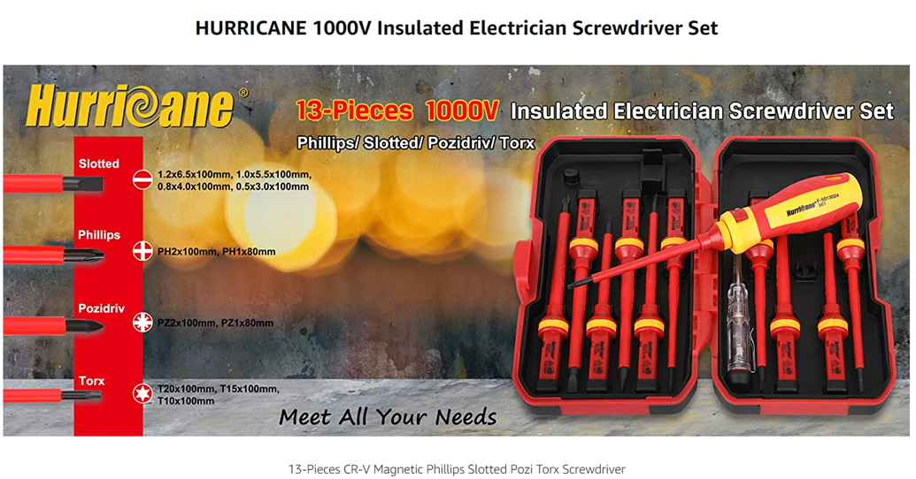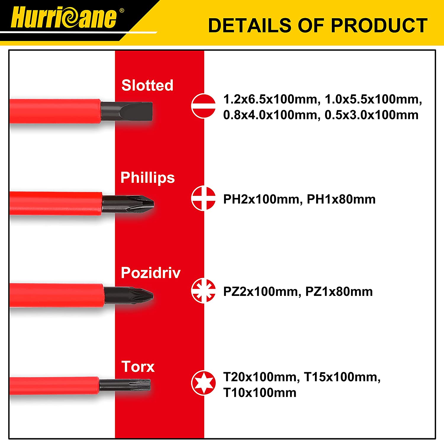 • You will get: 13 Piece HURRICANE 1000V CR-V Insulated Electrician Screwdriver Set with Magnetic Phillips Slotted Pozidriv Torx tips