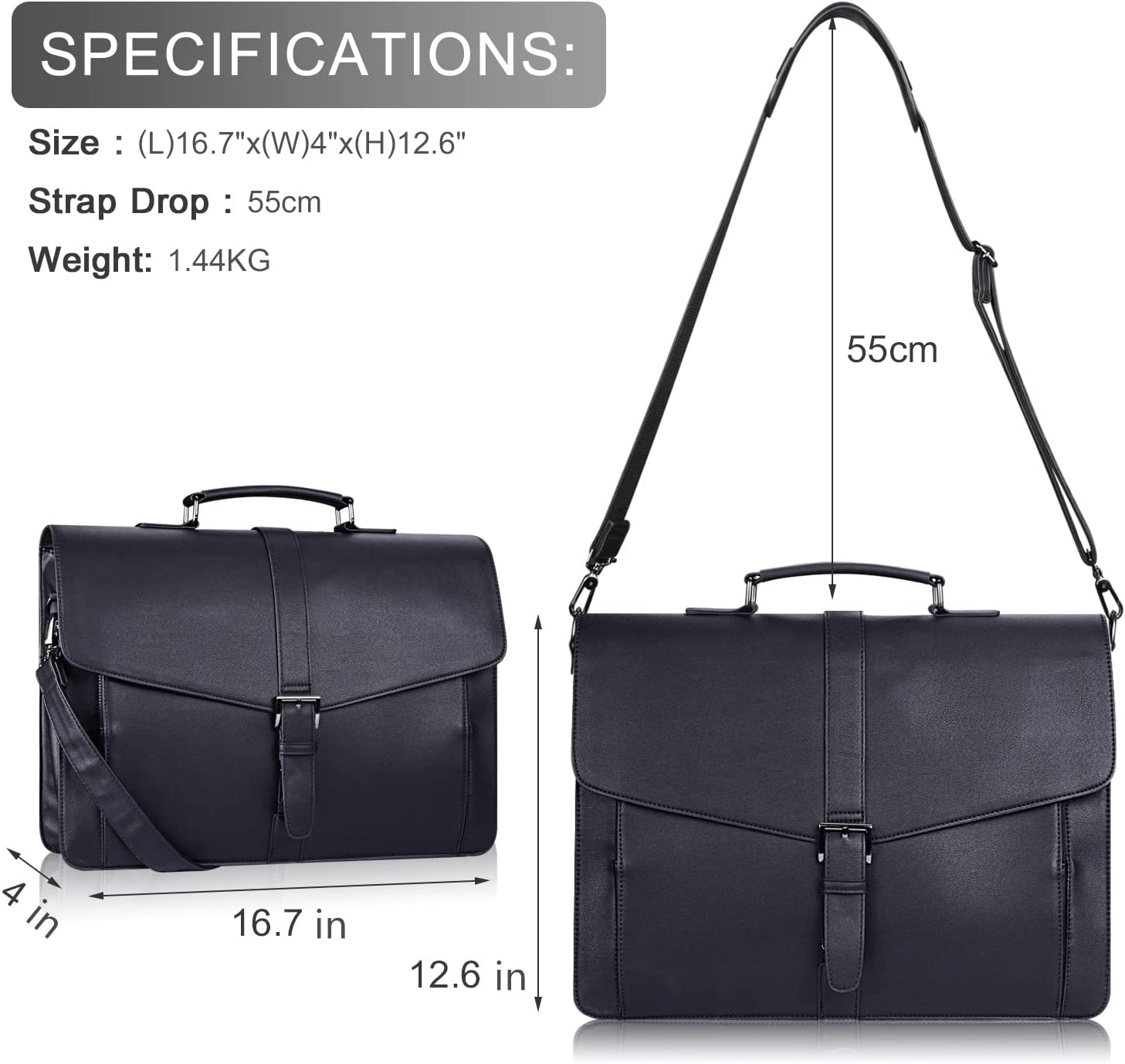 - High Quality Material: Vegan leather (pu leather), water-resistant. Briefcase size:17"(L)*4.5"(W)*12.5"(H). Strap length: max 62inch , min 20inch. Strap width: 1.2inch. Weight: 1.4kg, 3.09lb.