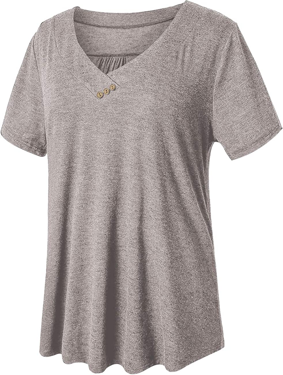 Womens Short Sleeve V Neck Blouse, Vibrant Color, Loose Fit, Button Decor Front Design