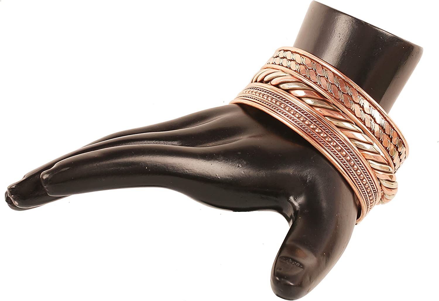 - Beautiful design and attention to detail. Handcrafted by rural artisans in India with techniques inherited through generations.Thick and sturdy. Lasts a lifetime. 3 different traditional designs of copper inlaid with Brass.