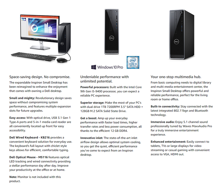 Dell Inspiron 3470 Desktop, 2 Year Onsite Service after remote diagnosis, 9th Gen Intel Core i5-9400 6-Core 4.1GHz Proc w/Intel Turbo Boost, 12GB DDR4 RAM, 1TB HDD+128GB SSD, DVD RW, Windows 10 Pro