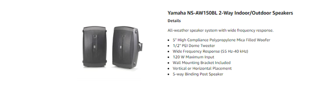 - Yamaha NS AW150 35W RMS Speaker 2 way; 1 pair of 2 way indoor/outdoor speakers